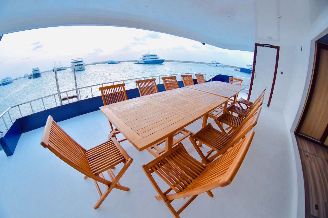 We use a specialized boat for scuba diving to keep the liveaboard dry and clean.
