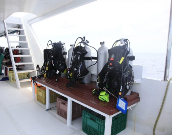 Oxygen tank, 4 Fire extinguishers, 30 Life Jackets, First Aid Box, Automated external defibrillator (AED), Nitrox compressor, Air compressor