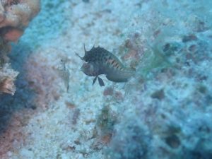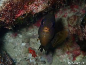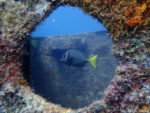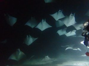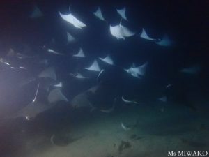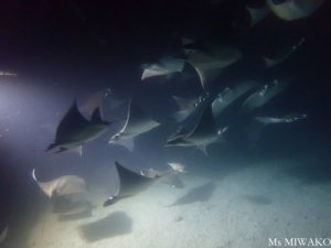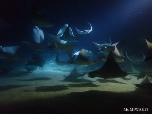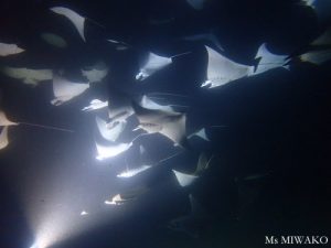 The day 3 started at Fang Ming wreck for the 1st dive of the day. I had to check up on the three Giant Jawfish juveniles here. They have thrived little by little. Sooner they will start showing their imposing figures but they are still shy in the nest at this moment. The 2nd dive of the day was at C-59, another wreck, bigger than Fang Ming. There was a big school of Snappers around the wreck. Plus, Blue and Yellow Chromises’ juveniles were seen. The 3rd dive of the day was at Whale Island, which was an island shaped like a Whale. There is a beautiful cave and a air pocket on the top, which we can show our face above the surface. We can also enjoy some swim through here. An underwater light may help you to observe well in the dark. The 4th dive of the day was Night Mobula! We could see more than a hundred of Mobulas! However, my favorite was a Porcupinefish tossed up and down by the Mobulas in the middle.