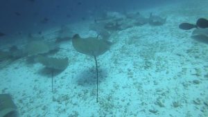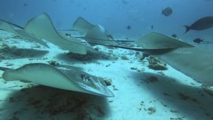 The day 5 was the last day of diving for this trip. The 1st dive of the day was at Nassimo Thila in the North Male Atoll. We settled at the place where all the currents hit. We could see the very aggressive attack of Dogtooth Tunas and Giant Trevallies. They might be so hungry. We also visited the overhang to see the colorful soft corals. The 2nd and the 3rd dive were at Fish Tank in the North Male Atoll. Oh my goodness. There were more than 30 of Pinkwhip Rays appeared in the sand area. It was very cool. And I have to mention about the Giant Guitarfish! He appeared and swam away for the deep side. We waited, waited, waited for him to come back to us. About 10 minutes later he really came back! And we could observe him very well. The air temperature was 26-33 deg.C. The water temperature was 26-28 deg.C. The 3mm wetsuit was recommended. Thank you all for joining us and also making this trip wonderful! Hope to see you all again!