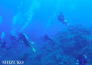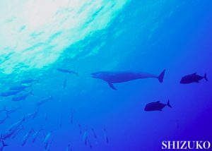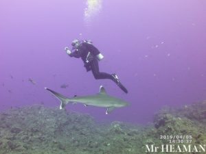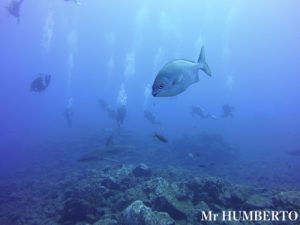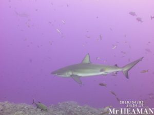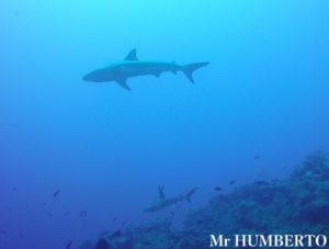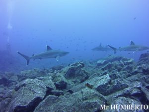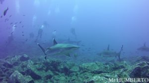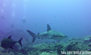 The day 2 at El Canyon in a row because of the strong wind at the El Boiler, the condition there was great. The hunting Dolphins were chasing fish in their top speed! They kept hunting around us so we just settled and observed. And all the sharks, Whitetip, Silvertip, Dusky, Galapagos and Hammerhead appeared again and again! At the end, a gigantic Tiger Shark showed up! It was about the size of a dinghy or even bigger! Yay! To be continued…