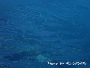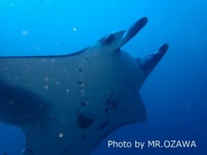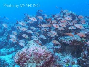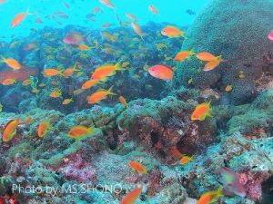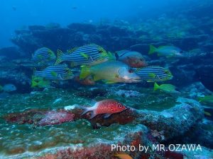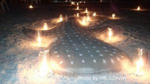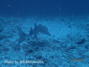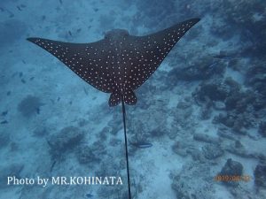 The day 3, the 1st dive of the day was at Maalhos Thila in the North Ari atoll. There was very strong current in the water. We immediately moved to the overhang to avoid getting swept away by the current. The inside of the overhang was covered by the beautiful blue soft corals. It was very fantastic scene with the blue soft corals, the yellow Bluestriped Snappers and the big red sea fan all combined. The 2nd and the 3rd dives were at Moofushi Kandu in the South Ari atoll. Yes! We got in first for this famous Manta spot. After us, other groups of scuba divers kept coming! We ended up sharing the spot and the two Manta Rays with about eighty scuba divers. For the 3rd dive we skipped the cleaning station and went to the deep side. Guess what we encountered with? It was a Bowmouth Guitarfish! Then, bunch of Grey Reef Sharks, about a half dozen of Spotted Eaglerays and Manta Rays were seen as well. Hooray! The 4th dive was at Radhdhiggaa Thila. It had to be a relax diving with going through the overhang. The inside of it was colored by the yellow soft corals. The huge schools of Blacktipped Squirrelfish, Sabre Squirrelfish and endemic Indian Bannerfish surprised us by their number. After dive we had a nice BBQ on the beach!
