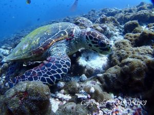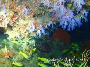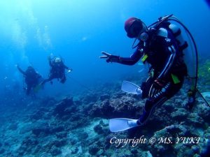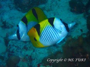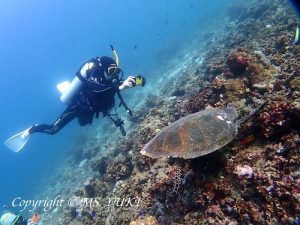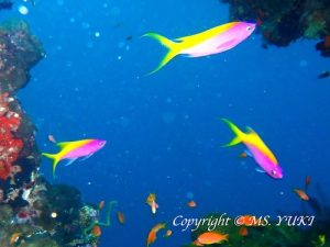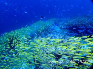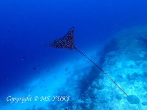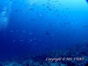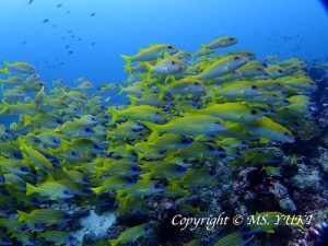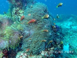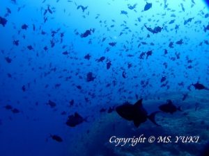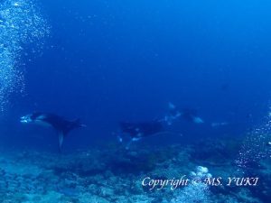 The day 3, as same condition as the day before, very clear weather with no wind. The 1st dive of the day was at Maalhos Thila in the South Ari atoll. We made it a drift diving because the current was a bit strong. There was a blue soft coral world inside of the overhang. It was beautiful. You must bring a underwater light to see the real color of the soft corals here. The 2nd and the 3rd dives were at Moofushi Kandu aiming for Manta Rays. We could successfully observed 5 Manta Rays at their cleaning station! Hooray! The 4th dive was at Dega Thila, which has tall-twin-towers look of reeves. A school of Tiera Batfish welcomed us. The thing impressed me most was the group of cute Blue-green Chromises on the table corals. The air temperature was 26-33 deg.C. The water temperature was 28-29 deg.C. To be continued…
