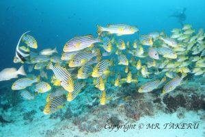 Hello, It is Keita again! Here is the latest trip report. The 1st dive was at Lankan Reef in the North Male atoll as a check dive. Although there was some surge to fight against in the water but we were welcomed by a school of Teira Batfish. And a couple of Manta Rays appeared finally at the end. The 2nd dive was at Finger Point. Grey Reef Sharks and Whitetip Sharks were everywhere! The visibility was great! Besides, more than three dozens of Spotted Eagle Rays showed up! Wow! After the dive we celebrated one of our guests birthday! It was such an honor to celebrate!