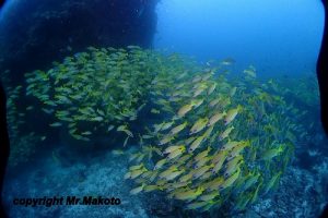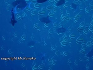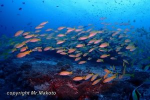 Day 2, the 1st dive was at Fish Head in the North Ari atoll. Even this popular dive site can be only for  us if we go very early morning. We did it in the early morning, of course it was exclusive to us. The Grey Reef Sharks were found as a school with Whitetip Reef Sharks at the place where the currents met. The incredible number of the fish here always surprise me. We moved to the South Ari atoll for the 2nd dive of the day at Moofushi Kandu. This was the first try for the season, because the site was well know as a Manta spot in the dry season. The visibility was great! We could see the 40 meter depth of the bottom. A big Napoleon and the juvenile of Spotted Eagle Ray appeared. And there were many of Whitetip Reef Sharks resting at the bottom. it was odd, but so many of them were there at about 10 meters intervals. Finally we saw a Manta Ray while our safety stop. Thanks!! The 3rd dive was at Kudarah Thila. We normally dive here in the early morning but it happened right before sunset that day. The Bluestriped Snappers and Humpback Red Snappers were very crowded at the reef.  Some guests worried about the big Camouflage Grouper underneath of the overhang was stuck there! We could see the male Indian Frame Basslets trying to court with opening their back fin wide to the female. And we also see some of them had nuptial coloration. After the dive we had a romantic BBQ dinner on the sand beach. The air temperature was 26-31 deg.C.  The water temperature was 28-29 deg.C. The 3mm or 5 mm wetsuit was recommended. The visibility was 10-30m. To be continued…